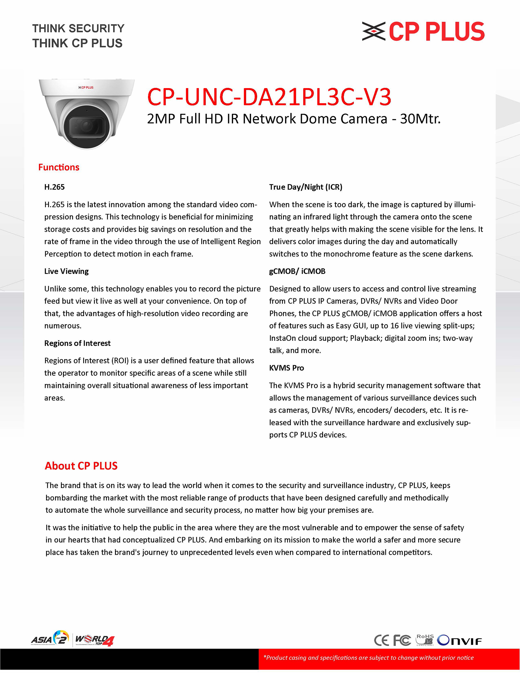 • DWDR, Day/Night (ICR), 3D-DNR, ROI, AWB, AGC, BLC, HLC